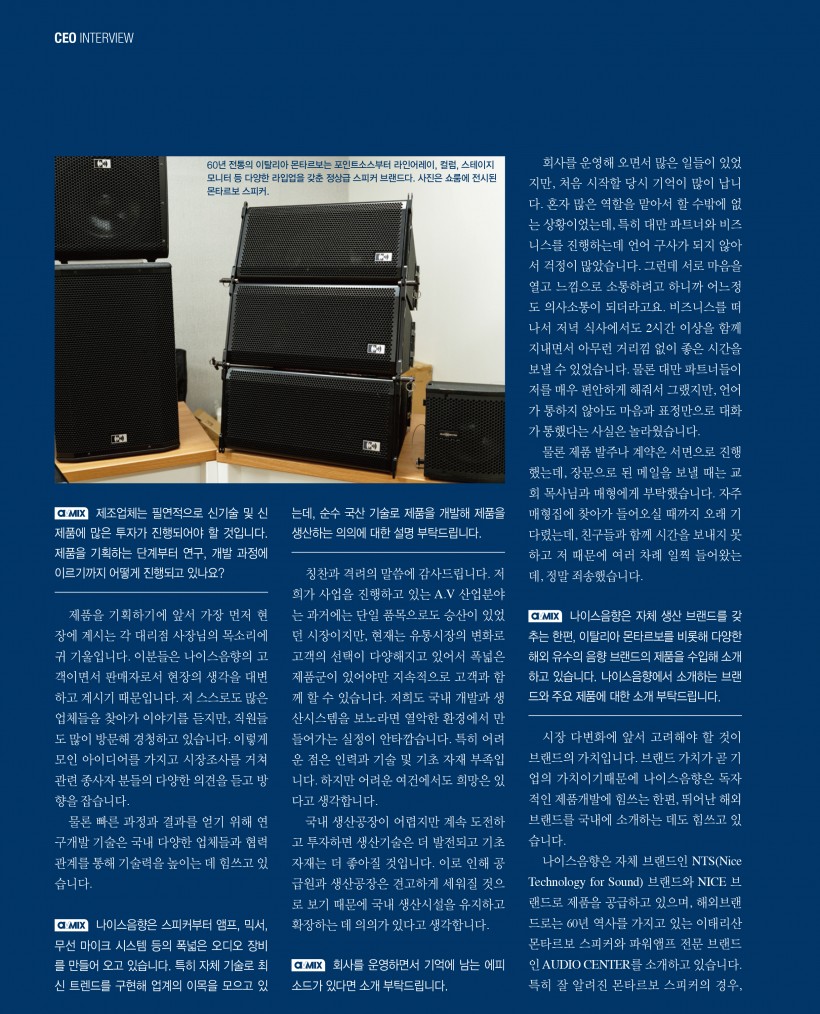 (주)나이스음향정보통신은 영상 및 방송 장비의 수입, 판매 및 공사를 하는 업체로 설립되어 현재에 이르고 있습니다. 1997년 6월에 처음 설립되어 현재 각종 산업체 및 관공서 및 학교,교회에 음향장비를 납품, 공사해오고 있습니다. 대만의 유명브랜드 McLELLAND, MASCOT,Audio Center 이태리브랜드 MONTARBO제품 등 명실상부한 국내 독점 총판으로서 저렴한 가격에 명품브랜드 못지 않은 뛰어난 품질의 제품을 공급해 드리고 있습니다. 현재 서울을 비롯해서 지방 각처에 대리점 및 협력점 네트워크가 구축되어 있으며 짧은 시간에도 불구하고 소비자로부터 탄탄한 신뢰와 명성을 쌓아가고 있습니다. 뛰어난 품질, 철저한 신용과신뢰를 바탕으로 음향업계의 최고가 되고자 전력을 다하고 있습니다. 감사합니다.